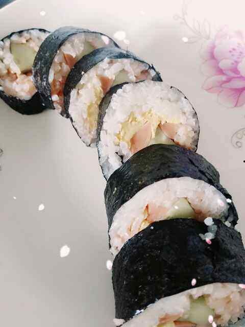 4. 摆放食材:在寿司皮上,依次放上寿司饭、黄瓜条、火腿片等食材。
